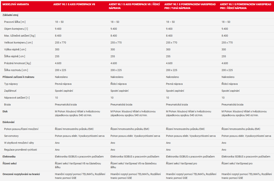 Dva základní modely, AXENT 90.1 vybaven rozmetacím ústrojím AXIS M PowerPack s mechanickým pohonem rozmetacích disků, určený pouze pro aplikaci minerálních hnoji a AXENT 100.1 s hydraulickým pohonem rozmetacích disků, PowerPack agregátem pro aplikaci minerálních hnojiv a navíc s možnosti výbavy UNIVERSAL PowerPackem pro aplikaci vápna a jiných práškových a sypkých organických hnojiv. Oba agregáty PowerPack u modelu AXENT 100.1 jsou na základním stroji vyměnitelné pomocí rychlovyměnného systému umožňujícího operativní použití pro rozmetání zmíněných materiálů. Regulace dávky, nastavení pracovního záběru, sekční hnojení i ostatní funkce jsou u AXENT 90.1. shodné s variantami nesených rozmetadel AXIS – M, totožný v tomto směru je rovněž AXENT 100.1 vybaven AXIS PowerPackem s funkcemi a možnostmi nesených rozmetadel AXIS – H.